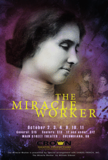 This classic tells the story of Annie Sullivan and her student, blind and mute Helen Keller. The Miracle Worker dramatizes the volatile relationship between the lonely teacher and her charge. Trapped in a secret, silent world, unable to communicate, Helen is violent, spoiled, almost sub-human and treated by her family as such. Only Annie realizes that there is a mind and spirit waiting to be rescued from the dark, tortured silence. With scenes of intense physical and emotional dynamism, Annie's success with Helen finally comes with the utterance of a single, glorious word: "water."