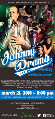 Loretta LaRoche Productions Presents Plymouth's Johnny Drama and his Funky Entourage! They are back to put the funk in funky at Plymouth's Memorial Hall on March 21st. Drama is an entertainer extraordinaire, whether yukking it up with Mark, Donnie and Paul on the Wahlburgers, or crooning and swooning to the mellow sounds of his band. Drama invites you to put on your fancy clothes, grab your best guy or gal, and party with the sounds that will keep your feet grooving, your body swaying, and your heart pumping all night long!