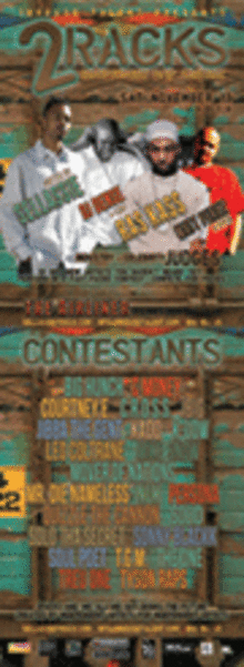 The 2Racks Rap Contest premiers in Los Angeles on November 13th at the historic Airliner in Lincoln Heights. Presented by Inhouse Talent and hosted by Revolutionary Poet Sellassie, The 2Racks Rap Contest is a fast-paced, single-elimination contest where the top upcoming artists will perform their original music, competing for cash prizes. Designed to expose interesting and determined emerging artists, cultivate relationships, and build community among independents, 2Racks is the newest component from Inhouse Talent, creating a movement where emerging artists thrive, and a place to discover the future in underground and independent emcees.