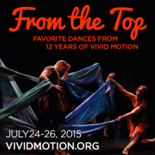 From the Top, favorite dances from 12 years of Vivid Motion. Friday 7/24 - 7:30pm, Saturday 7/25 - 2:30 & 7:30, Sunday 7/26 - 2:30pm. Tickets at vividmotion.org $13 adults, $6 kids under 13. More info at vividmotion.org
