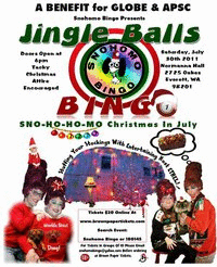 This is not your Grandma's Bingo!!! This is non-stop campy fun hosted by "ETHEL!!", a musical comedy performance troupe made up of members of the Seattle Men's Chorus. The only thing bigger than their talent is their hair! Come join us for the fun and win big cash prizes in a fun and safe environment! This is a non-alcoholic event, but don't let that discourage you. There's plenty of trash-talk and festive live performance to keep you in the party mood. This time the theme is "Jingle Balls Bingo!" So trim those trees and come decked to the balls and WIN WIN WIN! Organized and run by volunteers, all proceeds from this event benefit GLOBE (GLBTQ Youth Support Group) and Aids Project Snohomish County. *To purchase your own table of ten tickets please email snohomobingo@yahoo.com. This event is SUPER GAY! So, if you have a problem with that, please park your sleigh at home! Thanks ! :-)
