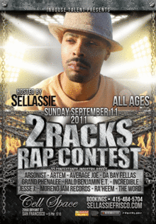 Inhouse Talent Presents 2Racks Rap Contest Hosted by Sellassie Sunday September 11, 2011 CELL SPACE 2050 Bryant St, San Francisco, CA 5p ALL AGES