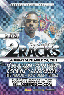 Presented by Inhouse Talent and hosted by Socio-political Rap Artist, Activist and Entrepreneur Sellassie, the 2Racks Rap Contest is creating a movement for upcoming and independent hip hop and packing clubs for new music. 2Racks is a fast-paced, single-elimination rap competition where emcees perform original songs head to head in front of celebrity and industry professional judges, competing for a $2000 cash prize. Designed to expose interesting and determined fresh talent, cultivate relationships, and build community, 2Racks is the newest component from Inhouse Talent, creating a fun and unique environment to discover and support independent artists.