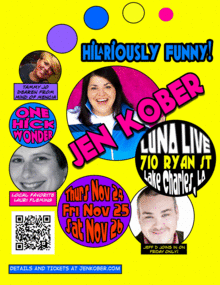 Originally from Lake Charles, LA - Jen Kober has bounded onto the national stage bringing crowds to their feet with her original blend of stand-up, story telling, and improvised rock-n-roll comedy. Her hard-hitting hour is phenomenally funny as Kober commands the stage and dares you not to laugh.