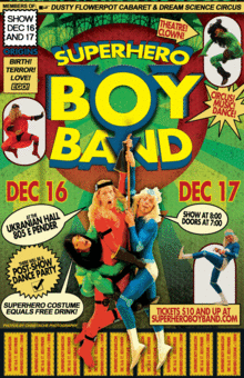 When you can't rely on the "1%" to solve the world's problems, to whom do you turn? The 0.00001% - The Superhero Boy Band. The MOST powerful, the MOST flamboyant, the MOST provocative, the MOST spandex, the most SUPERHERO BOY BAND! Topping the boy band charts, our trio of young superheroes - Magnum Orgasmo, Cptn SlipNSlide, and Exacto - struggle to save the world from the faceless perils of terror. Motivated by bitter-sweet love for their demanding parents and the need to appease thousands of adoring boy band fans, our heroes tumble head over heels, bashing apart the binaries of good and evil in their grueling quest to save the world.