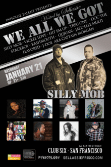 Sillymob www.myspace.com/sillymob Doc The Stackboy www.soundclick.com/docthestackboy JaZz-Elle Multi Flavored http://www.listn.to/Jazz-elle Kashmouth : http://www.facebook.com/pages/Ehd-Kash-Mouth/254314234633439 Vickee Love Qujuan Treu One J-Doe aka Captain Morgan For info: www.sellassiefrisco.com