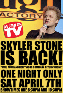 Stone was born in St. Louis, Missouri. He started his career in radio at WRKR in Kalamazoo, Michigan. He played Scarlett Johansson's husband in the flashback scenes for The Island., and a cook in Waiting... Stone was cast in Christopher Guest's For Your Consideration as a trashy radio morning show host after Guest saw the "Cancun Coma" episode of Con. In July 2007, Stone was cast in the comedy House Broken, as Danny DeVito's son. He appeared in the CSI: NY episode "Youngblood." Skyler was a contestant on Dog Eat Dog and Whammy! The All-New Press Your Luck twice (the second time in the Tournament of Losers). Skyler is a regular at the Laugh Factory, The Improv, and The Comedy Store, in Hollywood, California. He made his first national stand-up appearance on The Late Late Show with Craig Ferguson on January 3, 2007. He resides in Los Feliz, California