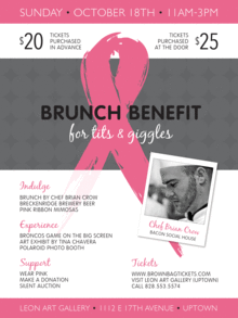 Please join us at Leon for a laid back Sunday brunch event in support of Breast Cancer Awareness Month. Enjoy a delicious meal prepared by Chef Brian Crow from Bacon Social House. Indulge in complimentary libations as you watch the Broncos game on the big screen and bid for fun items in our silent auction.