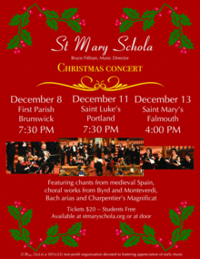 Concert is to be performed in Portland, Falmouth and Brunswick, with a post-concert gala immediately following the Falmouth concert hosted by The Episcopal Church of St Mary's "Sparkles" group. (The gala is a part of the church's annual fundraiser. All concert attendees are invited to attend).