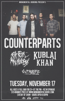 COUNTERPARTS (Pure Noise Records) https://www.facebook.com/counterpartsband FIT FOR AN AUTOPSY (Goodfight Ent.) https://www.facebook.com/FitForAnAutopsyOfficial KUBLAI KHAN (Artery Recordings) https://www.facebook.com/KublaiKhanTexoma GUTTERLIFE (We Are Triumphant) https://www.facebook.com/GutterLifePunk local opener tba