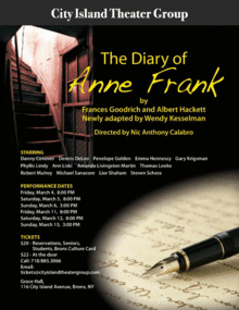 Danny Conover - Mr. Kraler Dennis DeLeo - Mr. Van Daan Penelope Golden - Margot Frank Emma Hennessy - Anne Frank Gary Krigsman - Mr. Dussel Phyllis Lindy - Mrs. Frank Ann Liski - Mrs. Van Daan Amanda Livingtson Martin - Miep Thomas Losito - Second Man Robert Mulroy - Mr. Frank Michael Sanacore - Third Man Lior Shaham - Peter Van Daan Steven Shera - First Man
