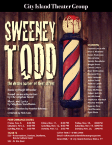 Friday, November 4 @ 8:00 pm Saturday, November 5 @ 8:00 pm Sunday, November 6 @ 3:00 pm Friday, November 11 @ 8:00 pm Saturday, November 12 @ 8:00 pm Sunday, November 13 @ 3:00 pm Friday, November 18 @ 8:00 pm Saturday, November 19 @ 8:00 pm Sunday, November 20 @ 3:00 pm Brian J. Alvarado - Sweeney Todd Alex Arlotta - Tobias Sandra Benedetto - Beggar Woman/Lucy Dennis DeLeo - Judge Turpin Mary DelVecchio - Johanna Demerre Files - Anthony Hope John Hartigan - Beadle Katie McAllister - Mrs. Lovett Ryan Slone - Pirelli