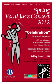 Thomas Almli will be directing the BC Celebration Vocal Jazz Ensemble. Opening the performances at 7 pm will be Guest Artists TBA. There will also be a celebration for Ken Wilson who is retiring. Tickets are $10 general admission and $7 student. The concert is in the Carson Theatre. The tickets will go on sale at 6:15pm and the doors will open at 6:30p. You can also pre-purchase your tickets online through www.brownpapertickets.com or 1-800 838-3006 starting May 17. For more information call Lyneen Patnoe at 425.564.3114 or lyneen.patnoe@bellevuecollege.edu