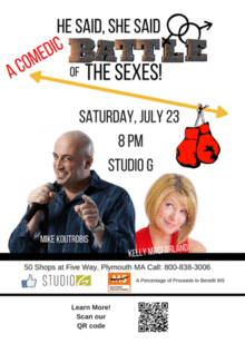 He Said, She Said. A Comedic Battle of the Sexes! Relationships are difficult at best! Part of the problem is due to the fact that men and women see the world differently. A sense of humor is a life saver especially if you can identify each others idiosyncratic behavior as part of a sitcom. Being able to laugh at each other without being offensive, can help create a long lasting, fun life together. Laugh as Kelly MacFarland and Mike Koutrobis enteratain you with the long and short of being in the world of men and women!