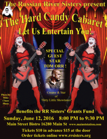 Hard Candy Cabaret will be held at one of the Russian Rivers favorite performance venues, Main Street Bistro, located at 16280 Main Street, in Guerneville. The show starts at 8:00 pm. Tickets are $10 in advance on the Sisters website, http://www.rrsisters.org or $15 at the door.