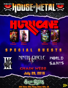 Hurricane featuring Mike Hansen, Michael O'Mara, Tony Cavazo and Robert Sarzo make their Shamrock's debut on Friday night July 29, 2016. Performing all their 80s hard rock classics such as "I'm On To You", "Over The Edge", "Hurricane" and more.