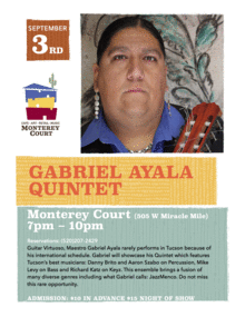 A member of the Yaqui people of southern Arizona, Gabriel Ayala(Guitarist) is at the forefront of a new generation of Native Americans making a career performing jazz & classical music. He earned a Masters Degree in Music Performance from the University of Arizona in 1997, has taught at all educational levels from elementary through college, and serves as a competition adjudicator. Ayala performs regularly throughout the United States, Canada, and around the globe, and has appeared at the Poway Center for Performing Arts, John F. Kennedy Center for the Performing Arts, National Museum for the American Indian, and Oscar Meyer Theater in Madison, Wisconsin. In 2010, Gabriel was honored to perform at the Musical Instrument Museum in a series called Guitar Masters. He has played for the Pope and President Obama, and was selected as one of ten musicians featured in Native Musicians in the Groove highlighting stories of musicians in their struggles while persevering with a career in music.