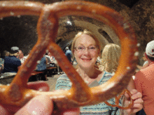 Pictured: Christine Amos as seen through a giant pretzel in a Roman Wine cellar in Rodestien, Germany along the Rein River.