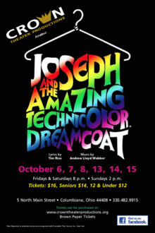 The Biblical saga of Joseph and his coat of many colors comes to vibrant life in this delightful musical parable. Please join Crown Theater Productions in "Joseph and the Amazing Technicolor Dreamcoat" live on stage at Main Street Theater! Directed by Erich Offenburg.