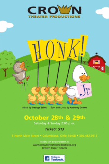 Ugly looks quite a bit different from his darling duckling brothers and sisters. The other animals on the farm are quick to notice and point this out, despite his mother's protective flapping. Feeling rather foul about himself, the little fowl finds himself on an adventure of self-discovery, all the while unknowingly outwitting a very hungry Cat. Along the way, Ugly meets a whole flock of unique characters and finds out being different is not a bad thing to be. Please join Crown Theater Productions in "Honk Jr." presented by Crown's special needs cast live on stage at Main Street Theater! Directed by Erich Offenburg.