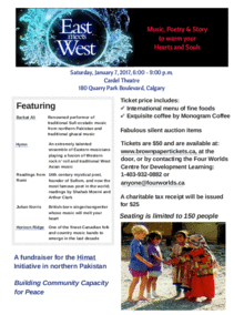 This is a fundraiser for the Himat Peace-building Initiative in northern Pakistan. Please visit www.fourworlds.ca/himit for more information about this extremely cost-effective and result-oriented program that is working with 120 remote, high mountain villages to strengthen livelihood, build human resources and ignite a spark of hope and a vision of positive possibility.