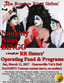 The Russian River Sisters of Perpetual Indulgence are proud to present a night of fun, fundraising and frivolity as only the Sisters know how This is not like any other Bingo game you've ever played. Picture your Grandmother's church hall bingo crossed with the Rocky Horror Picture Show, and the Sisters in their best drag-nun attire.