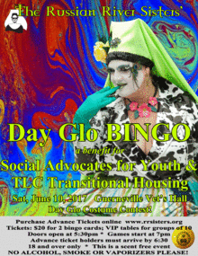 The Russian River Sisters of Perpetual Indulgence are proud to present a night of fun, fundraising and frivolity as only the Sisters know how This is not like any other Bingo game you've ever played. Picture your Grandmother's church hall bingo crossed with the Rocky Horror Picture Show, and the Sisters in their best drag-nun attire.