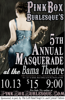 Ladies and Gents, Mark Your Calendars: 13 October is the PBB's 5th Annual Masquerade at the Bama Theatre! Come see the PBB Ladies and Gents perform feats of danger, terror, amazement and sexiness all with the help of the amazing PBB Band! Guest Stars, New Acts and a Night to Remember!