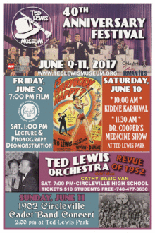 This is a brand new revue and the highlight of the museum's three-day 40th Anniversary Festival. The show will feature all new acts and music from the Ted Lewis Museum archives, as well as all the old favorites. As Ted's advertising used to say everything is new except the old high hat! This is a show that will be long remembered in the annals of Circleville history. For more information on the other FREE events during the festival June 9-11 visit www.tedlewismuseum.org