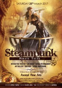 Come out to see Pirate Tales, an Interactive Theater show put together by the students and staff of Ascend Flow Arts. Aerial Performances by Kim Freedman, Chi-Wen Lee, Ken Tenaro, Brianna Wendt, Kristina Milionta, and Avrie Toutkaldjian. Between acts enjoy the Art Gallery, Live Music, and Craft Beers and wine served by our aerial bartenders. This is a lounge style event with acts throughout the night.