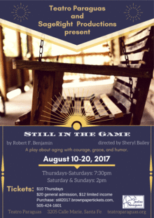 Teatro Paraguas and SageRight Productions will present a new play by Robert F. Benjamin of Los Alamos entitled Still in The Game for 10 performances, opening Thursday August 10, 2017 at Teatro Paraguas in Santa Fe.