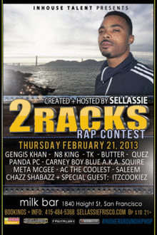 2Racks Rap Contest announces its return to San Francisco on February 21, 2013. 2Racks is a Nation-Wide Original Song Contest started in 2010 by Sellassie and Inhouse Talent in San Francisco, CA. 2Racks Rap Contest stops in more than 12 cities from coast to coast including Los Angeles, New York, San Francisco, Berkeley, Chicago, DC, Atlanta, Austin, Houston, Orlando & Seattle. 2Racks looks forward to bringing the event back to the hometown turf.