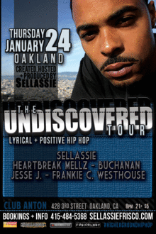 The Undiscovered Tour announces a Northern California Stop on January 24, 2013 in Oakland, Ca. The Undiscovered is a Nation-Wide Showcase Tour created and produced by Sellassie and Inhouse Talent in San Francisco, CA. The Undiscovered Tour is designed to market, promote and expose a facet in Hip Hop that is often taken for granted, The Upcoming, Independent Emcee the Future of Hip Hop. Contrary to the notions that "Hip Hop is dead" and totally fallen victim to swag, violence, money and negativity, The Undiscovered will prove otherwise.