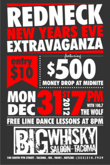 -It's the BIGGEST party of the year -BIG ASS CASH drop at MIDNIGHT -FREE LINE DANCE LESSONS at 8:00PM -ADMISSION includes a PBR toast & party favors. -THIS EVENT IS 21+ -tickets available at brownpapertickets.com