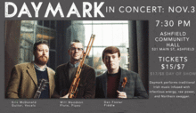 Daymark is an international trio performing traditional Irish music infused with infectious energy, raw power, and Northern swagger. Fusing the talents of Will Woodson (flute, border pipes), Dan Foster (fiddle) and Eric McDonald (guitar, vocals) the group presents a classic blend of wind and string as driving flute meets virtuosic fiddle, underpinned by well-considered and expertly delivered guitar.