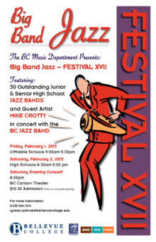 BC's Jazz Band directed by Hal Sherman will host the 17th annual Big Band Jazz Festival. There will be 32 Washington and Oregon High Schools and Middle Schools competing for top honors. Friday will be an all day event for Middle Schools with the top 3 schools and 8 individual awards to be handed out at the end of the day. High schools and will compete all day on Saturday until 5 pm when the top 3 schools will be selected for the evening concert. The evening concert will start at 8 pm with the top 3 high schools and the followed by our own BC Jazz Band performing Big Band Music. There will be a guest artist, Mike Crotty, performing a clinic on Saturday during the lunch hour as well as he will be performing with the BC Jazz Band in the evening concert. You can pre-purchase your evening concert tickets online through Brownpapertickets.com or 1-800 838-3006 starting Jan 11th. For more information call Lyneen Patnoe at 425.564.3114 or lyneen.patnoe@bellevuecollege.edu
