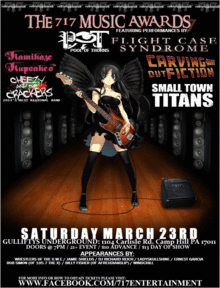 717 Entertainment, based out of Mechanicsburg Pennsylvania is set to present their annual 717 Music Awards show on March 23rd live at Gulliftys Underground. The show which is in its 7th year is the first and only awards show of its kind. Fans are asked to vote online in 11 categories such as "Artist of the Year", "Best New Artist", "Best Metal band" among others. Voting (this year over 10,000 votes will be cast) is conducted through a polling system and only 717 Entertainment knows the results, which leads us to March 23rd. That's the night when everyone finds out the winners in a Grammy style show full of live performances (This year acts include: Flight Case Syndrome, Pool of Thorns, Carving Out Fiction, Cheezy & The Crackers, Small Town Titans and Kamikaze Kupcakes), Local area celebrities (Members of the U.W.E, Fitness guru Jamie Shields and From Dusk til dawn Actor Ernest Garcia just to name a few) and anyone who's anyone in the local and regional scene. www.facebook.com/717enertainment