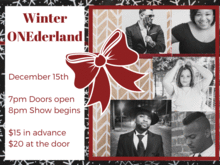 We ARE One, and this night will celebrate the music of the season. "Winter ONEderland" will bring together people of all backgrounds to enjoy their favorite holiday music of all different interpretations. Your vocalists of the evening will be Misha Roberts, Lee Langston, Shon Ruffin, Anthony Robinson, and Joe Gallant. Doors open at 7:00pm. Show is at 8:00pm.