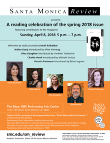 Sunday, April 8, 5-7 PM. $10. A reading celebration of the fall 2017 issue featuring recent contributors to the magazine, hosted by SMR editor Andrew Tonkovich. Welcome by radio journalist Sonali Kolhatkar, with readings by Halina Duraj, Alisa Slaughter, Charles Hood and Victoria Patterson. Edye Second Space, Broad Theater-SM College Performing Arts Center, 1310 11th Street, Santa Monica, CA, 90401. Refreshments, books for sale. Free parking!