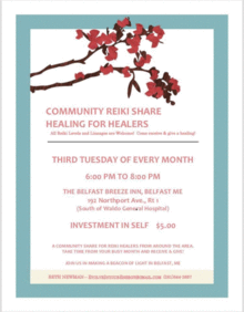 Reiki Share for Practitioners with Beth Newman Give healing and receive healing! Share! Third Tuesday of the month from 6-8p $5 per person pay at the door