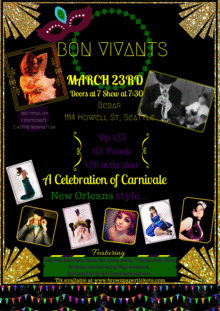 The 2nd annual Bon Vivants! An evening of music, dance, strip tease and tinsel in the style of the Big Easy... Live music from Le Bon Temps Band and one of a kind performances from Vixy Post, Verity Germaine, Penny Banks, Ronda Bordeaux, Hunny Bee, Jason Kirk and introducing Nigel Smallwood. Join the ride with our incomparable riverboat queen, Cherry Manhattan as the Mistress of Ceremonies. You've never seen Festival quite like this before...