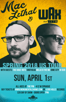 Mac Lethal returns to Spokane, WA to bring his fast-rap talents as seen on YouTube with Def Jam famed Wax. These talents combined will be sure to give one of the most memorable hip hop events of the year!