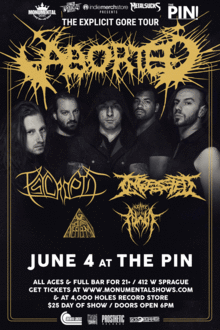 One doozy of a metal line up with legendary ABORTED (BEL) along with tour mates PSYCROPTIC (AUS) and INGESTED (UK). Joining them will be local Symphonic Metal veterans AGE OF NEFILIM and the local up-and-comers HEART OF AN AWL. Let's get those heads banging and circle pits rolling!