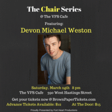 Devon Michael Weston is thrilled to be performing on stage alongside his fellow Vancouver Film School graduates. Devon has performed in productions of The Rocky Horror Show and Beauty and the Beast, as well as multiple cabaret-style events. After graduating from VFS's 1 Year Acting program, he has been an active volunteer for numerous VFS projects and collaborations. Devon would like to thank Mariel Kathryn Hunter and John McGie for their guidance and mentorship over the past months and hopes to collaborate with them again in the future.