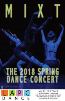 The Pierce College Performing Arts Department will be presenting a multiplicity of dance styles for the Spring 2018 Dance Concert. This years collection of modern-day works is representative of the most current dance, and musical trends on campus today. The choreographic works will include dance styles such as hip-hop, salsa, bachata, musical theater, swing, modern jazz, ballet folklórico, and other contemporary dance forms. The performance is filled with zany concepts, energetic music, dynamic choreography, and over ten different dance genres! This is not your ordinary college dance concert. Come see the creative diversity that represents the Pierce College Dance Division!