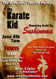 You will get to watch the classic Karate Kid on the big screen while you sip sake or wine and eat your sushi bento box provided by Sushinoma! After the movie sit back for a Q&A with Robert Kamen the writer of the Karate Kid!