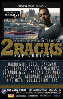 2Racks Rap Contest announces the return to Atlanta on March 21, 2013 2Racks is a Nation-Wide Original Song Contest started in 2010 by Sellassie and Inhouse Talent in San Francisco, CA. 2Racks Rap Contest stops in more than 12 cities from coast to coast including Los Angeles, New York, San Francisco, Berkeley, Chicago, DC, Atlanta, Austin, Houston, Orlando & Seattle. 2Racks looks forward to returning to Atlanta, the home of such a thriving independent music scene.