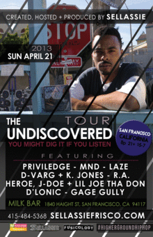 The Undiscovered Tour announces 9 California dates this April 2013. Created and produced by Sellassie and Inhouse Talent, The Undiscovered is a Nation-Wide Showcase Tour designed to market, promote and expose a facet in Hip Hop that is often taken for granted, The Upcoming, Independent Emcee. Contrary to the notions that "Hip Hop is dead" and totally fallen victim to swag, violence, money and negativity, The Undiscovered will prove otherwise. The Undiscovered Tour is focused on positive and lyrical Hip Hop.