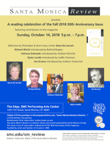 Sunday, October 8, 5-7 PM. $10. A reading celebration of the fall 2018 Thirtieth Anniversary Issue featuring recent contributors to the magazine, hosted by SMR editor Andrew Tonkovich. Welcome by celebrated filmmaker and short story Steve de Jarnatt, with readings by magazine founder Jim Krusoe, Vishwas Gaitonde, Dylan Landis and Richard Wirick. Edye Second Space, Broad Theater-SM College Performing Arts Center, 1310 11th Street, Santa Monica, CA, 90401. Refreshments, books for sale. Free parking!