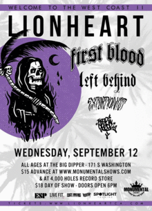 Lionheart comes to Spokane for what may be one of the most memorable hardcore shows in the area for years joined by friends First Blood, Left Behind and Extortionist. This is a high-energy show and one not to miss.